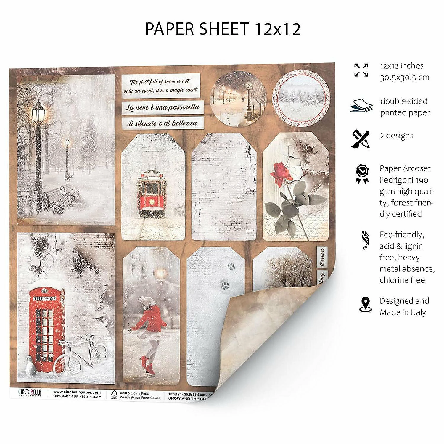 Ciao Bella Have A Happy Snowy Day Paper Sheet 12″x12″ Snow and the City is a state of mind where every city girl can lives in her dreams. When snow falls, benches of each city become a front row seat at Broadway, street lamps illuminate precious crystals that sparkle like Van Cleef & Arpels, streets and gardens turn into Saint Moritz, every light shines like a premiere at La Scala. With this best-seller paper pad, the first in our industry using a color palette of red, black and sepia for a winter collection, there is only one thing left to say: snow, welcome to the City! In scrapbooking industry, Ciao Bella paper collections are about Italian high quality. They feature versatile patterns and styles, perfect for a variety of applications. Great original illustrations and color palettes, often bold and unconventional, have been thought out in details to get the most from any sheet. All of the lines are printed in Italy with organic inks on forest-friendly certified paper by a carefully selected team of professionals specialized in traditional printing Italian skills. 12×12 inches (30,5×30,5 cm) double-sided printed sheet 2 designs; includes images of snow falling wintery city scenes with a girl skating, parks, benches, street lights, street cars and phone booths on one side and a marble design on the other side Paper Arcoset Fedrigoni 190 gsm high quality, FSC Forest friendly certified Acid & lignin free, heavy metal absence, chlorine free Designed and Made in Italy