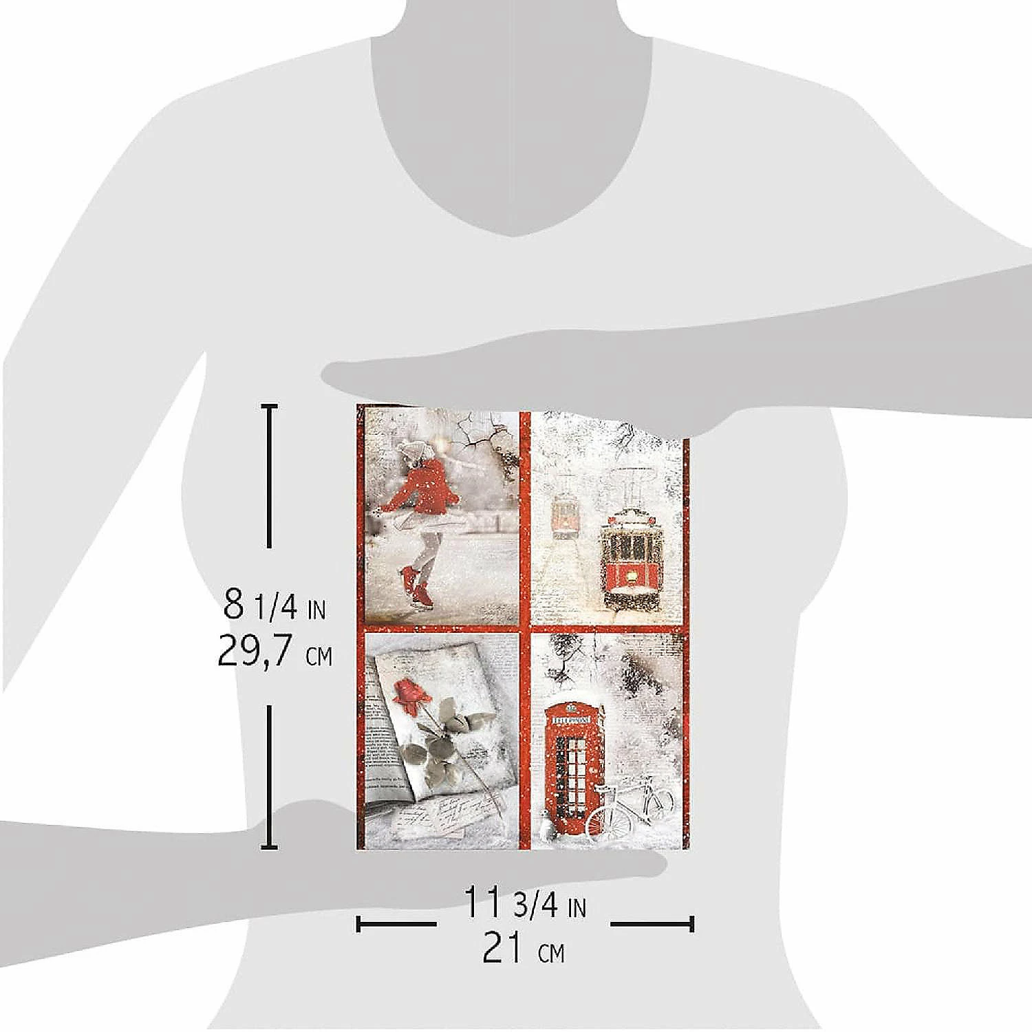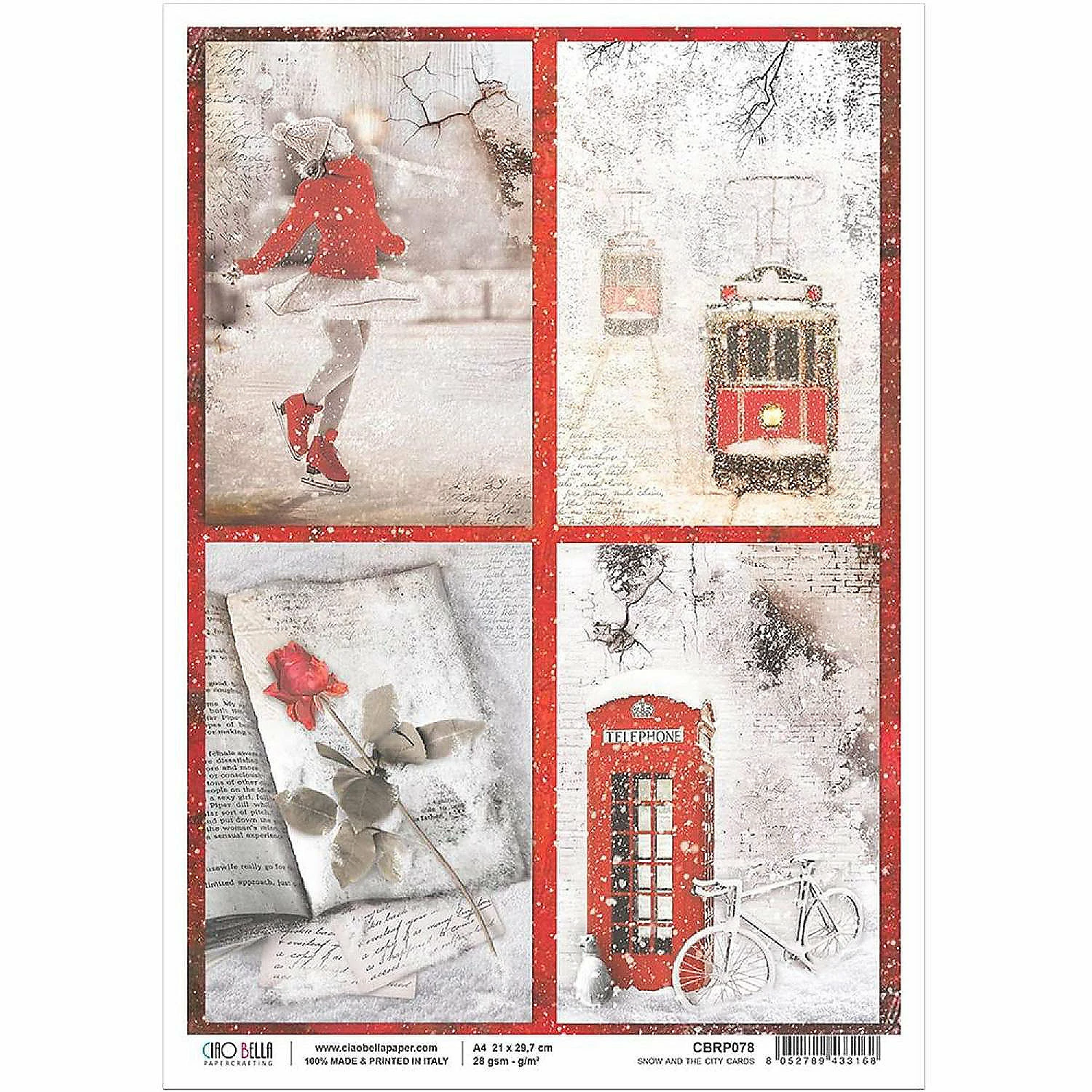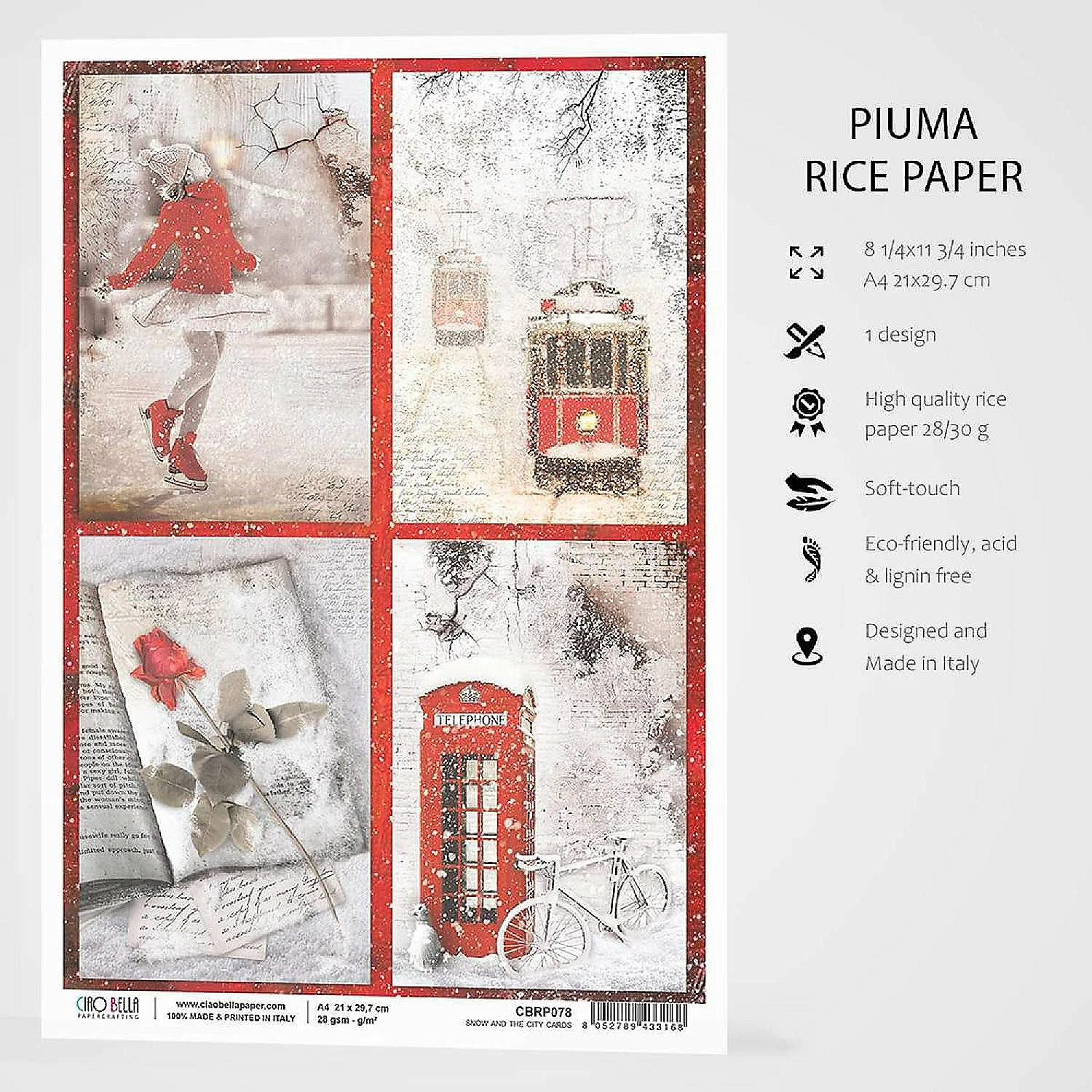 Ciao Bella Rice Paper A4 Snow And The City Cards Snow and the City is a state of mind where every city girl can lives in her dreams. When snow falls, benches of each city become a front row seat at Broadway, street lamps illuminate precious crystals that sparkle like Van Cleef & Arpels, streets and gardens turn into Saint Moritz, every light shines like a premiere at La Scala. With this best-seller paper pad, the first in our industry using a color palette of red, black and sepia for a winter collection, there is only one thing left to say: snow, welcome to the City! Piuma is the line of textured rice paper by Ciao Bella. Is an excellent paper not only for decoupage but also for mixed media and other art & craft techniques. The paper is very lightweight but strong and the printing technique, made entirely in Italy, makes it a unique product for design and quality. There is a slightly smooth side and a soft-touch side, which gives interesting results. A4 – 8 1/4×11 3/4 (21×29,7 cm) 1 design; includes 4 images of snow falling wintery scenes with a girl skating, street cars, a phone booth and bike and a book and a rose High quality rice paper 28/30 gsm Soft-touch Acid & lignin free Designed and Made in Italy