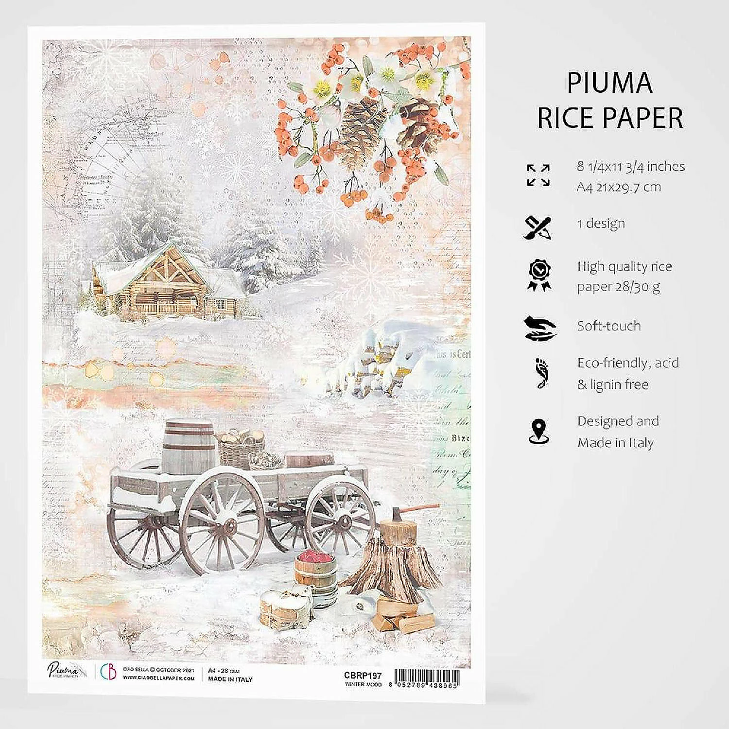 Ciao Bella Rice Paper A4 Winter Mood Winter is the gift season. The incredible true story of love between a girl, an Alaskan Malamute and Arabian horse, beautifully illustrated by our artists, made us think that the best gift takes time, cannot be bought with money but itβs built slowly in the heart. Above all, it knows no boundaries of race. The gift of love. This collection in a warm color palette powder pink, orange and ice blue, will accompany you in the gift season, inspiring to think with whom and how to expand the sharing of your gift. The more it extends the more it will warm your heart and make you feel good, like a glass of hot apple cider in a cold winter day. Piuma is the line of textured rice paper by Ciao Bella. Is an excellent paper not only for decoupage but also for mixed media and other art & craft techniques. The paper is very lightweight but strong and the printing technique, made entirely in Italy, makes it a unique product for design and quality. There is a slightly smooth side and a soft-touch side, which gives interesting results. A4 – 8 1/4×11 3/4 (21×29,7 cm) 1 design; includes an image of a wintery scene with a house, a wagon filled with supplies and an axe for chopping wood High quality rice paper 28/30 gsm Soft-touch Acid & lignin free Designed and Made in Italy