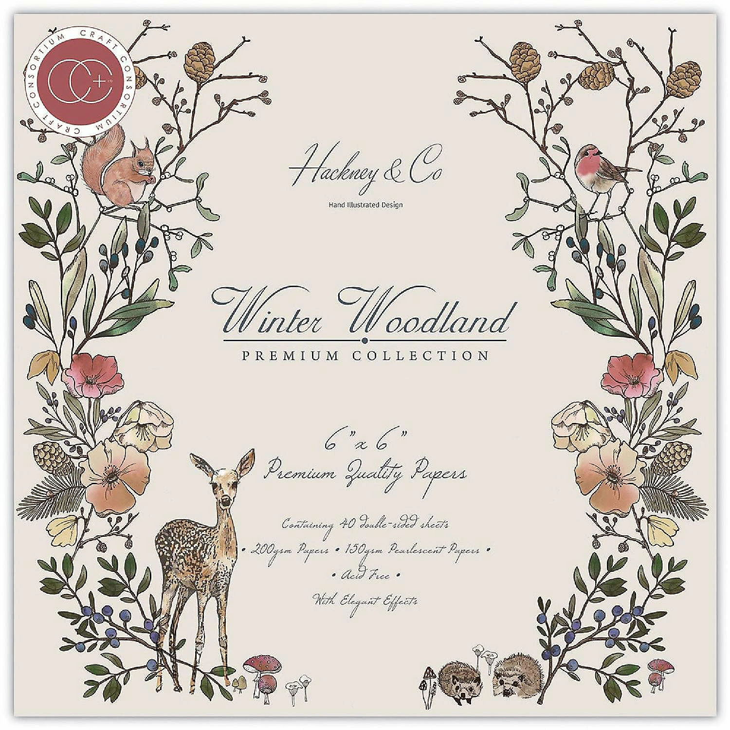 Craft Consortium Winter Woodland – 6×6 Paper Pad Premium 6″x6″ gummed paper pad with both inner front and back covers adorned in topper and ephemera elements and ephemera, the pad containing 40 double sided sheets in heavyweight 200gsm, acid free cardstock. Ideal for die-cutting and distressing. With elegant pearlescent, textured and spot varnish effects.