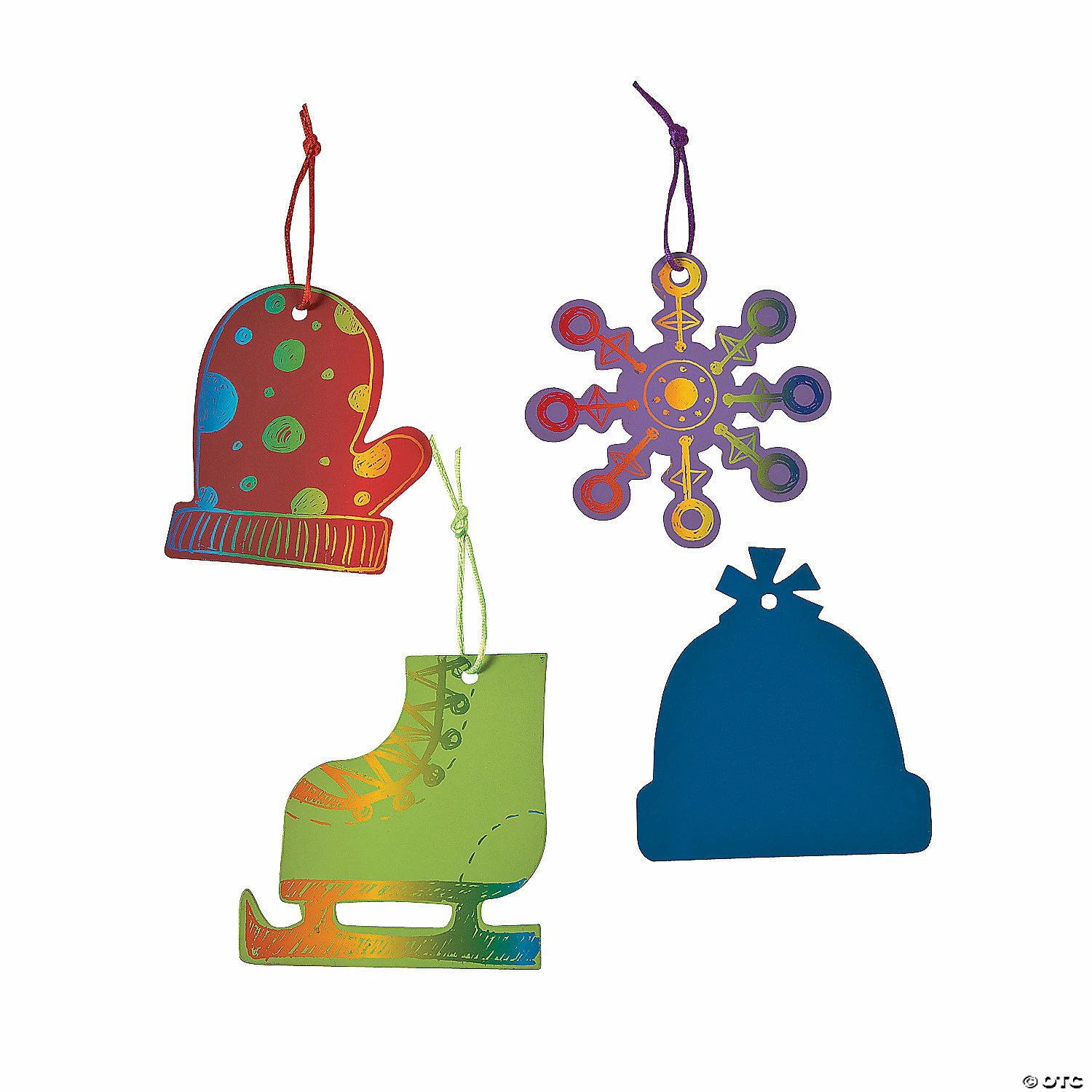 Magic Color Scratch Winter Christmas Ornaments. Create your own message or design on these winter shapes! Includes snowflakes, hats, mittens and ice skate shapes. (24 paper shapes, 12 scratching tools and 24 satin ribbons per unit) 4″ – 4 1/4″ ยฉ OTC