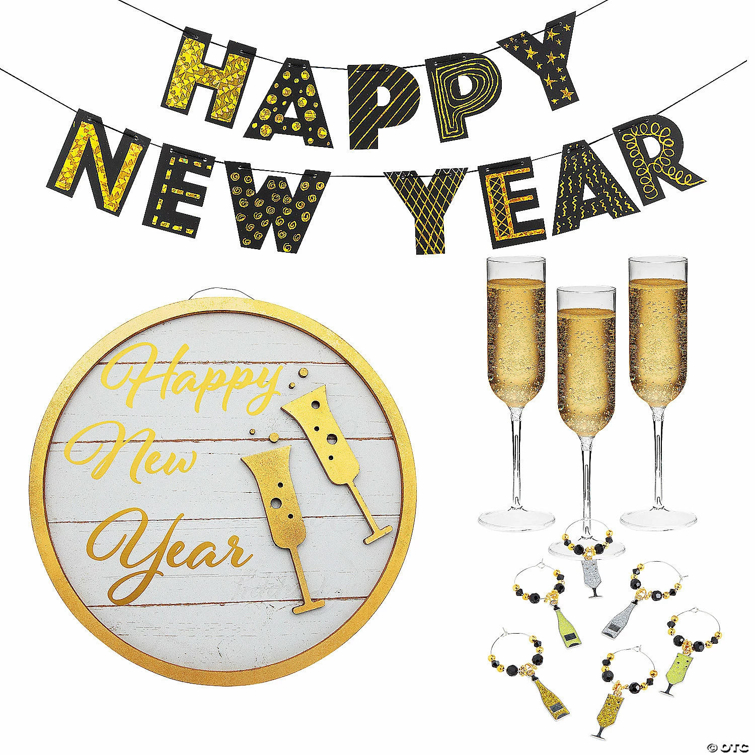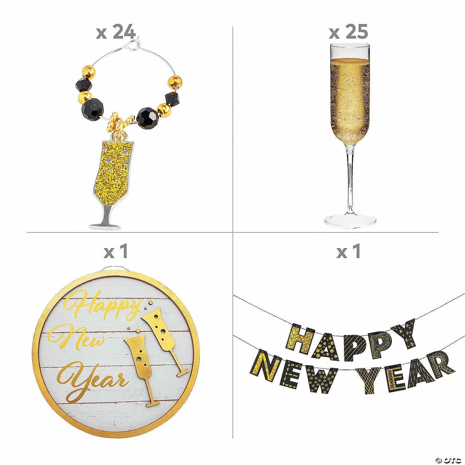 Get the party started with this New Yearβs Eve kit! Whether youβre hosting a rockinβ New Yearβs Eve party at your home, work or community event, this kit can help you kick off the new year on the right foot. Just add champagne, loved ones and your own countdown to midnight! (64 pcs. per unit) Assortment may vary.Includes:β’ 1 Happy New Year Wood Sign Craft Kit (Includes wood, vinyl stickers and metal hardware for hanging. Some glue required, sold separately. 16″ diam. Kit includes instructions.)β’ 25 Plastic Clear Plastic Champagne Flutes (9 1/4″ 4 oz.)β’ 24 New Yearβs Champagne Charms Craft Kits (Includes metal and glass. 1 1/4″ x 2 1/2″ All craft kit pieces are pre-packaged for individual use. Kits include instructions. Jewelry pliers required, not included.)β’ 14-Pc. Cardstock Magic Color Scratch Happy New Year Banner (Includes 12 letters, 12 plastic scratching tools and satin string. Assembled, 64″ x 3 1/2″. Simple assembly required.)