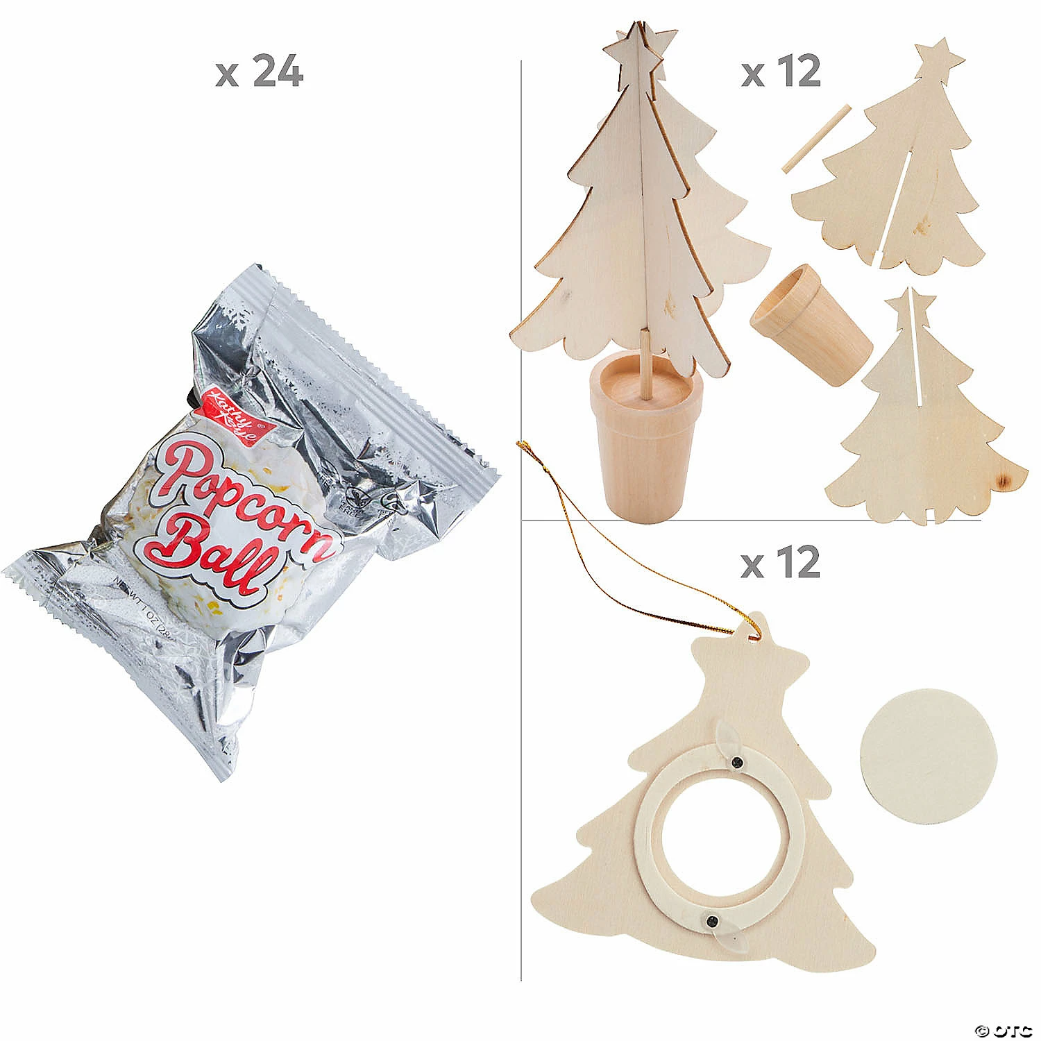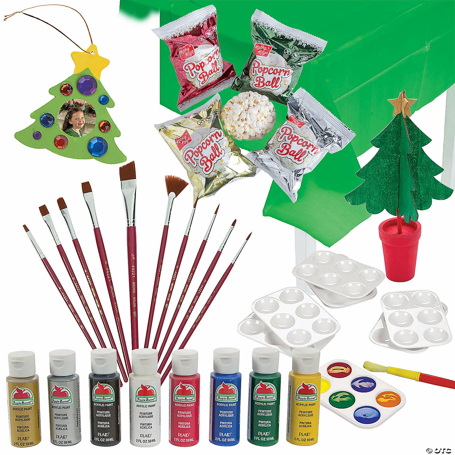 Enjoy a fun day of holiday crafting and snacking with this craft kit filled with art supplies, crafting projects and delicious cookie treats! This craft kit has everything needed for a fun crafting date. Get up to a dozen kids together for some crafting and snacking fun that will help make the holidays even more special. (95 pcs. per unit) Assortment may vary.Includes:โข 8 Acrylic Paints (Includes 8 primary colors each in a 2-oz. plastic bottle. Safe and non-toxic. Conforms to ASTM D-4236.)โข 12 DIY Unfinished Wood Christmas Tree Picture Frame Ornaments (4 1/2″ x 4 1/2″ with a 1 1/2″ photo space.)โข 12 DIY Unfinished Wood Potted Christmas Trees (4″ x 7″)โข 1 Plastic Green Tablecloth (54″ x 108″ Thin, slightly transparent. Disposable.)โข 12 Plastic Rectangular Paint Palettes (5 1/4″ x 3 3/4″)โข 20 Wooden Plaidยฎ Brown Nylon Paintbrushes (6 7/8″ – 7 7/8″)โข 24 Christmas Popcorn Balls (Total wt., 1 lb)