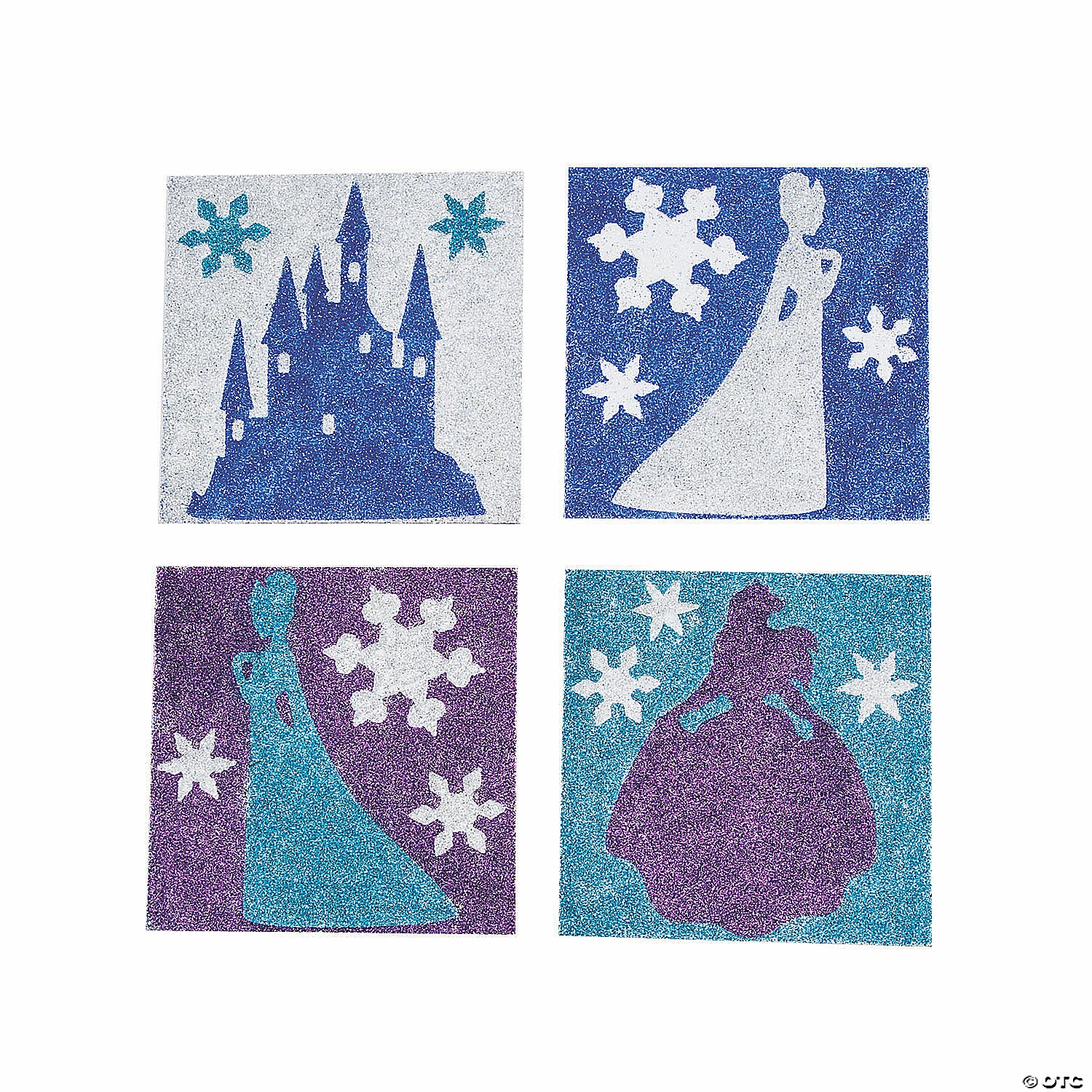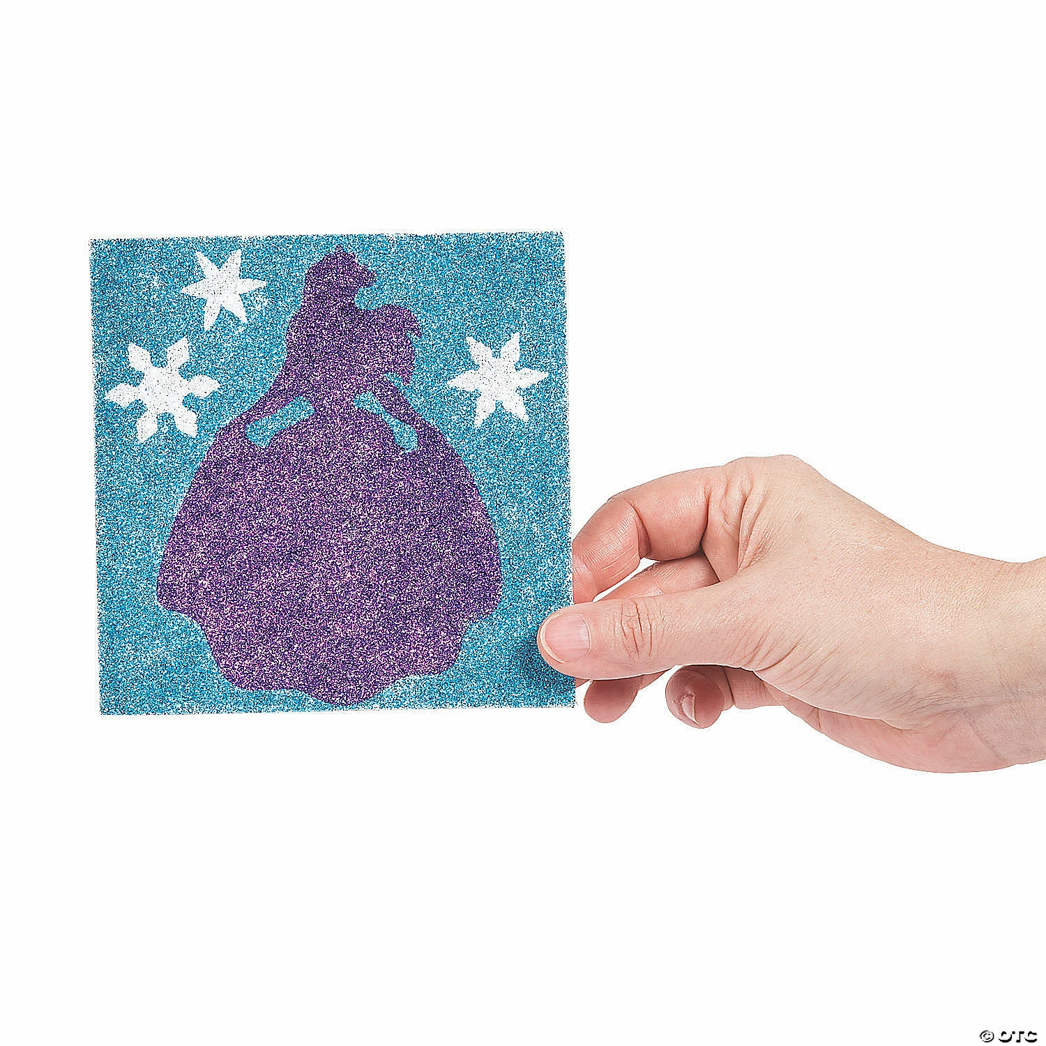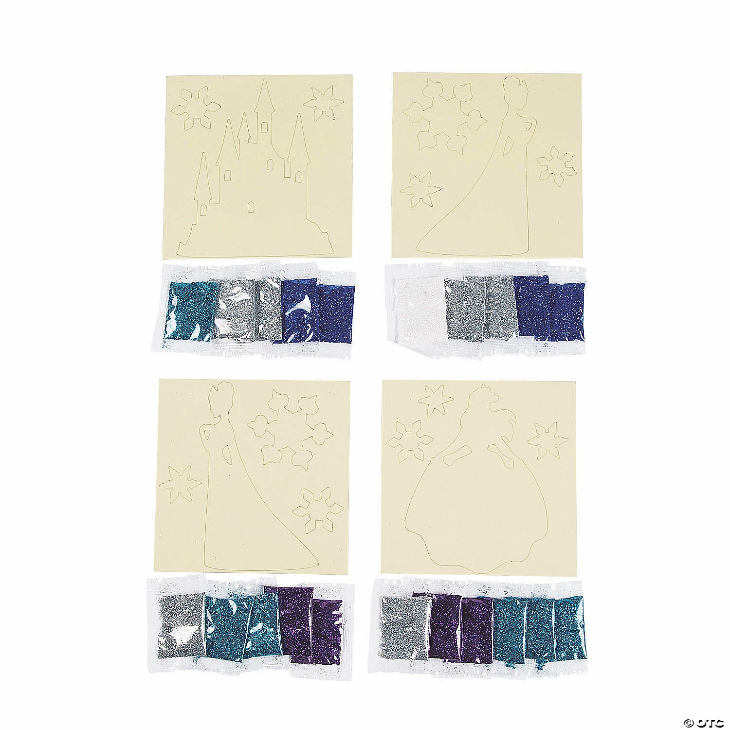 For a royal crafting experience, stock up on these Winter Princess Glitter Art Pictures! Perfect as a princess party activity or group kids’ craft, the glitter art allows children to creatively decorate silhouettes with sparkling blue, purple and silver glitter! The all-in-one kit includes everything you need to complete the Winter Princess art! Simply peel off the protective covering to reveal an adhesive surface, then sprinkle on the glitter. Includes assorted bags of glitter. Self-adhesive cardboard. 5″ x 5″ Makes 12. © OTC